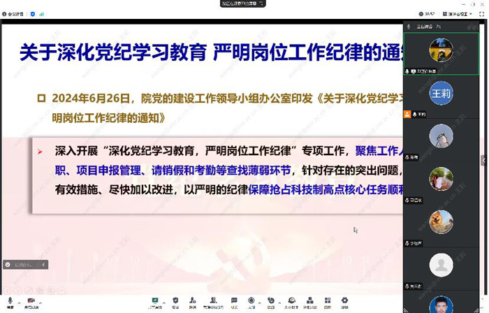 为深入贯彻落实院党组关于“深化党纪学习教育,严明岗位工作纪律”专项工作的要求,2025年4月17日下午,高温结构材料研究部第二党支部组织召开了“严明岗位工作纪律”主题党日活动,主要宣讲学习了抢占科技制高点背景下“三项制度”的重要意义,深入挖掘、宣传了科学家在严明岗位工作纪律方面的典型事迹。 支部书记张健同志首先围绕“深化党纪学习教育,严明岗位工作纪律”主题,结合中国科学院2024年和2025年重要工作会议精神,深入解读《中国科学院工作人员兼职管理办法(试行)》《中国科学院加强和改进院属单位科研项目管理的指导意见》等文件要求,系统阐述科研项目申报管理、人员兼职管理和岗位管理“三项制度”的重要意义。 之后,与会党员分享讨论了老一辈科学家严守工作纪律的动人事迹。通过研讨,大家进一步加深了“严明纪律不仅是政治要求,更是科研攻关的客观需要”的认识。 本次活动通过理论学习与实践研讨相结合的方式,推动了纪律教育走深走实,为加快抢占科技制高点凝聚了思想共识。