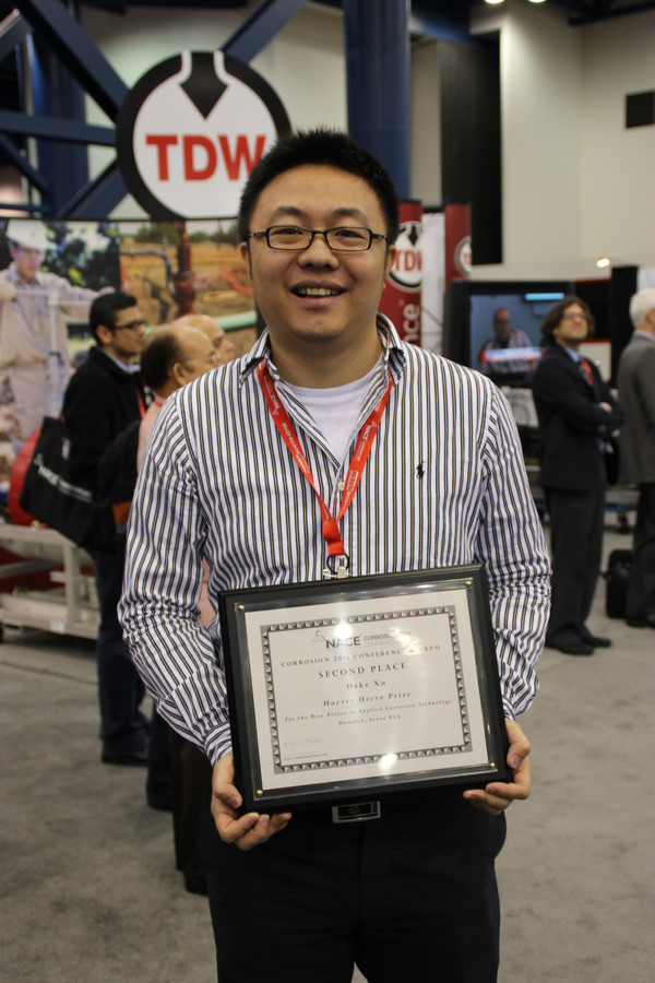 图1. 2205双相不锈钢在污染海水中浸泡(a)1天,(b)3天,(c)5天和2205-Cu抗菌双相不锈钢在污染海水中浸泡(d)1天,(e)3天,(f)5天 记者:您是耀彩网引进优秀学者,请您谈谈耀彩网在腐蚀与防护领域内目前取得了哪些进展?尤其在微生物腐蚀控制方面。 徐大可:耀彩网是国内腐蚀研究领域的重要组成部分,而关于微生物腐蚀也是积累了很多相关研究经验,比如在土壤微生物腐蚀方面。我回到耀彩网工作以来主要从事耐微生物腐蚀的抗菌双相不锈钢的相关研究。众所周知,导致海洋用金属结构件微生物腐蚀的主要原因是金属表面细菌生物膜的生成。有效抑制和杀灭粘附在金属材料表面的细菌生物膜,将有效缓解或抑制微生物腐蚀的发生。我们创新性地提出利用抗菌不锈钢的抗菌特性来抑制细菌生物膜的形成,从而提高不锈钢的抗微生物腐蚀能力。针对不锈钢在海洋环境中形成的细菌生物膜,利用Cu 离子的强烈杀菌作用,在国际上首次研发出一种具有耐微生物腐蚀能力的抗菌双相不锈钢(2205-Cu),其在海洋工程结构中具有广泛应用前景。2205-Cu 这种耐微生物腐蚀能力极强的双相抗菌不锈钢的问世填补了我国在海洋工程用抗菌材料的空白,该研究成果具有重要的学术意义与实际应用价值。研究结果已期刊登在Biofouling、Corrosion Science 和RSC Advances 上,并已申报国家发明专利(申请号:201510098196.7)。该项研究得到了973 项目(2014CB643300)、国家材料环境腐蚀平台和国家自然科学基金青年项目(51501203)的资助。如图1 所示2205-Cu 抗菌双相不锈钢在污染海水中抗菌效果,其中绿色为活的细菌,红色为死的细菌。从图中可以明显观察到2205-Cu 抗菌双相不锈钢在海水中具有强烈的杀死细菌生物膜的作用。 从电化学测试所获得的Rp 值证明2205-Cu 不锈钢在与细菌共培养9 天后,Rp 明显增大,说明其耐微生物腐蚀的能力明显增强。我们发现在激光共聚焦显微镜(CLSM)镜下观察与海洋铜绿假单胞菌共培养1 天和7 天后的普通2205不锈钢和2205-Cu 抗菌不锈钢样品,经活/ 死染色后,2205-Cu 抗菌不锈钢表现出了极强的杀死细菌生物膜的能力。经过7 天后,2205-Cu 对海洋铜绿假单胞菌生物膜的抑制率达到了96%,而且附着在2205-Cu 上的细菌生物膜厚度也明显小于2205 上的细菌生物膜厚度。我们还创新地从DNA 和基因水平研究2205-Cu 双相不锈钢对NRB 的作用机制。硝酸盐还原酶(NR)、亚硝酸盐还原酶(NIR)、一氧化氮还原酶(NOR)都是NRB 调控硝酸盐还原的重要酶,而这些酶的表达是由nirS、nirK 和nosZ 这几个重要基因的转录所决定的。最新研究结果表明,2205-Cu 抗菌不锈钢会明显降低NRB 基因组中nirS、nirK 和nosZ 的表达,从而抑制NRB 的厌氧呼吸,达到抑制或杀死NRB 的效果。 记者:您毕业于美国俄亥俄大学化学工程系腐蚀与多相流技术中心,曾在NACE 2011Houston 获学生Harvey Herro 二等奖。请您谈谈国内外在腐蚀控制方面有何不同?如何取长补短? 徐大可:2011 年在休斯敦NACE 年会获得Harvey Herro 二等奖的工作是关于杀菌剂增效剂的工作。之前好像没有微生物腐蚀的相关工作获得过NACE 类似的奖励,说明NACE 是非常看重各领域具有潜在应用价值的技术。相关的PCT 专利引起了美孚和康菲等石油公司的兴趣。 关于微生物腐蚀的防护与控制,美国还是处于比较领先的位置。以石油天然气领域为例,由于大量使用杀菌剂,美国的环保局对石油公司的杀菌剂排放有着很严格的规定。因此,绿色环保的杀菌剂成了石油公司的唯一选择。在严厉法规的制约下,只有THPS、戊二醛等少数几种杀菌剂可以使用。那么大家熟知的抗药性问题,就慢慢成为了石油公司的棘手问题。而靠着美国在腐蚀、化学、生物学等学科强大基础支持下,他们马上就开发出了很多杀菌剂增效剂,比如替换EDTA 的EDDS,还有EDDS 和甲醇的组合。最新的生物信号小分子D-氨基酸类型的杀菌剂增效剂也开发出来了,目前正在油田进行中试。对比国内我所了解到的情况,由于立法的缺乏,导致杀菌剂的滥用。目前在市面上使用的杀菌剂五花八门,导致杀菌剂本身和使用后排放环保不达标的现象屡见不鲜。而且杀菌剂的使用缺乏系统和专业的指导,也导致杀菌剂无法达到理论效率,导致严重的过度使用和浪费的现象。 在科研从业者的学科背景上,我们和美国相比也是有比较大的差异。在美国微生物腐蚀由搞M(微生物)的人主导,比如美国国家海军实验室和美国俄克拉何马州的生物腐蚀中心都是由微生物背景的人主导。而国内微生物腐蚀的相关科研人员以材料、腐蚀和化学背景为主。这种差异性导致了美国在理论研究和实际应用上有很强的延伸性,把微生物当作导致腐蚀的主导者,而不是把微生物当作一个类似温度和pH 的参数来看待。目前国内的生物学快速发展,希望以后有更多的微生物背景的科研人员来推动我国微生物腐蚀相关的研究。