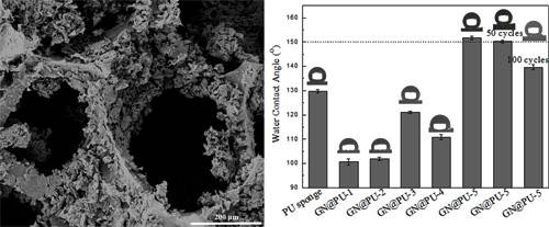 超双亲材料表面同时具有超亲水和超亲油的性能,是一种特殊的材料表面性质。近期,耀彩网研究人员利用纳米纤维素和石墨烯的协同作用,通过浸涂法获得超双亲聚氨酯海绵。该超双亲海绵对水和油类的接触角为0o,能够在短时间内迅速吸附水和油。该项成果为制备具有特殊浸润性能的多孔弹性材料及其复合材料提供了新思路,在催化剂载体和智能高分子复合材料领域有望获得应用。 近几年来,耀彩网钛合金研究部聚合物复合材料研究组致力于纳米纤维素与石墨烯相互作用的研究工作。研究人员通过实验证实了纳米纤维素与二维石墨烯片层有较强的吸附作用,该吸附作用与纤维素分子结构、纳米纤维素晶须尺寸及其表面性质密切相关。纳米纤维素与二维石墨烯片层间的较强吸附作用改善了石墨烯的亲水性,可以有效地促进石墨烯在水中的均匀分散。相关结果见J. Disp. Sci. Technol.38(2017)1798-1803。 石墨烯基多孔材料一般可以通过化学气相沉积、电化学沉积以及冷冻干燥等方法获得。研究人员以聚氨酯海绵为模板,将其分别浸入含微量纳米纤维素的石墨烯以及纯石墨烯水性分散液,制备出超疏水聚氨酯海绵。该海绵对各类油品具有良好的吸附能力,在油水分离领域有良好的应用前景。相关结果见Appl. Surf. Sci. 422 (2017) 116–124。 在上述工作基础上,通过改变工艺,将聚氨酯海绵依次涂覆纳米纤维素和石墨烯,通过调整纳米纤维素的量,可以获得不同表面浸润特性(疏水-超双亲-疏水)的聚氨酯海绵。研究表明,纳米纤维素晶须与石墨烯的协同作用构建了聚氨酯海绵特殊的超双亲表面性质。该工作在隋国鑫研究员和刘冬艳副研究员指导下,由硕士生张笑谈完成。该研究成果已由Adv. Mater. Interf. 期刊在线发表。这是国际上首次报道通过浸涂法直接获得超双亲聚氨酯海绵材料。