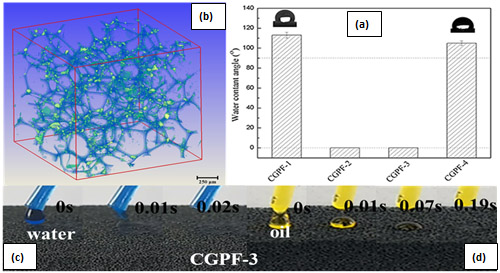 图二 超双亲聚氨酯海绵接触角随纳米纤维素浓度变化(a)、三维形貌(b)以及对水(c)和油(d)的吸附效果