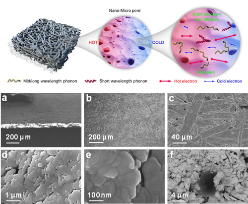 图 复合柔性热电材料原位弯曲电学性能测试及利用人体体温与环境温差形成的热电压 耀彩网邰凯平研究团队首次采用非平衡磁控溅射技术,以纤维素纸为基体,制备出具有微米至纳米多尺度孔隙结构的碲化铋(Bi2Te3)复合热电薄膜材料,如下图所示。