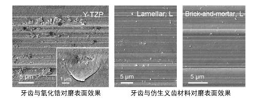 图2:牙齿(牛牙)在模拟口腔环境中与氧化锆以及新型仿生义齿材料对磨后的表面形貌