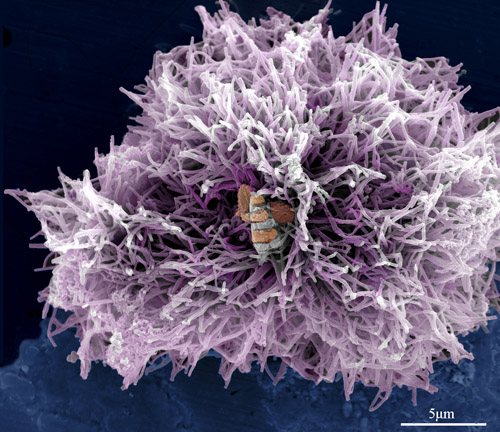 图片是在纤维状的聚苯胺样品的扫描样品,就像是海中挥舞的海葵触角,而在海葵中央另外一块样品类似【海底总动员】里的小丑鱼尼莫。