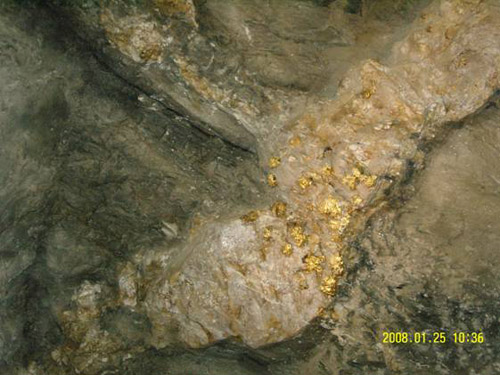 本图2008年1月摄于澳大利亚Ballarat的Sovereign Hill金矿的地下矿井。 图中左上右下对角线为黑色富炭线,左下右上对角线为金矿脉。富炭线中的活性炭对矿脉中原始成矿热液中的金络合离子进行吸附还原,经过较长地质年代积累后,在两条线的相交处,形成大块的单体自然金(“狗头金”)。这个结果,实际上就是现行先进的活性炭吸附提金法在自然界的完美演示。地质上,黑色富炭线也称吸金线,找到了黑色富炭线,一般意味着就找到了“狗头金”。不过,黑色富炭线在自然界中稀少,与金矿脉相交的概率更是少之又少,因此,发现“狗头金”的概率极低。 随想——科学源于对自然的探知。深奥的科学,在自然界实际上非常简单的存在着。越深奥的东西,往往又非常简单,而且,又特别完美。 |