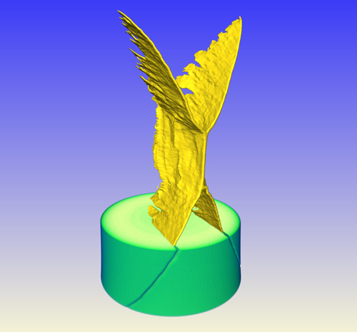 作者信息: 沈阳材料科学国家(联合)实验室/公共技术服务部/王绍钢-翱翔 图片描述: 本作品展示的是粗晶铜样品在扭转疲劳载荷下产生的疲劳裂纹的三维形貌。该疲劳裂纹在三维空间受力扩展后呈现出飞天之势,如雄鹰展翅,亦如艺术家的雕塑作品。本作品的获得过程:首先对粗晶铜棒进行热处理,然后加工成扭转疲劳样品,在万能力学试验机上加载后,利用高分辨X射线三维成像系统获得近两千幅二维投影,通过数学算法进行三维重建,再利用Avizo可视化软件进行光滑处理、裂纹提取及三维可视化,最终得到铜棒内的疲劳裂纹的三维可视化图像。该图像是真实的三维疲劳裂纹,是样品内部结构特征在扭转疲劳载荷下产生的自然美感,不是模拟的结果,也没有经过Photoshop的处理。该图像取自扭转疲劳样品平行段中间的一段,绿色部分是铜棒,金色的裂纹部分所对应的铜棒进行了透明化处理,以更好地展示扭转疲劳裂纹。该样品由疲劳部提供,特此感谢! 取样仪器名称型号:高分辨X射线三维成像系统 Xradia Versa XRM-500