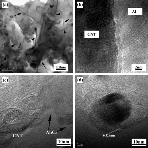 搅拌摩擦加工制备碳纳米管(CNT)增强铝基复合材料。采用常规粉末冶金加后续搅拌摩擦加工(FSP)的方法制备了体积分数为1-3wt.%的CNT/2009Al复合材料。随FSP道次的增加,复合材料中CNT团聚逐渐减少。微观结构分析表明,在4道次FSP的CNT/2009Al复合材料中,CNT呈单根形式分散于铝基体中,基体晶粒明显细化;CNT长度在400nm以上,并保持良好的层状结构;大部分CNT-Al界面干净、清洁,但部分CNT与Al界面上观察到Al4C3相的生成。与基体合金相比,1wt.%和3wt.% CNT/2009Al的屈服强度分别提高了23.9%和45%,其强化效果可由一个考虑载荷传递与晶粒细化共同作用的强化方程来预测。本工作为CNT增强轻质合金复合材料提供了一种非常有效的制备方法。相关工作见Z.Y. Liu et al.,Carbon,50 (2012) 1843;Compos. Sci. Technol.,72 (2012) 1826。 Fig. 1 TEM images showing (a) singly dispersed CNT in Al matrix,(b) interface between Al and CNT,(c) Al4C3 in Al matrix near CNT,(d) layer wall structure of CNTs in 4-pass FSP 3 wt.% CNT/2009Al composite.