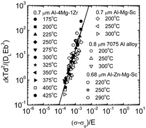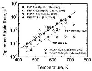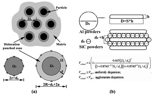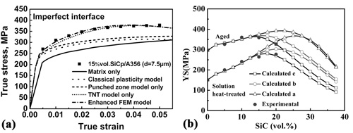 Fig. 2 Comparison of experimental and calculated yield strength of CNT reinforced composites (the straight lines denote calculated yield strength). 搅拌摩擦加工超细晶铝合金变形机制。超塑性本构方程预测,随温度升高,最佳超塑应变速率增大。然而由于细晶结构高温下易粗化,该预测没有得到很好的实验验证。FSP超细晶Al-4Mg-1Zr含有大量热稳定的Al3Zr弥散粒子,在175-425oC温度范围内表现出良好的低温/高应变速率超塑性,最佳超塑性应形速率 、最大延伸率和应变速率敏感指数m值随温度T升高而增加。通过超塑性数据统计分析,建立了 和T之间的定量关系: =0.0182T+C (C是与材料和结构相关的常数)(图3),这为超塑变形中温度影响的理论预测提供了直接的实验验证。对FSP超细晶Al-4Mg-1Zr 及其它FSP超细晶铝合金超塑性数据的深入分析发现,它们的低温和高温超塑变形机制均以晶界滑移为主,其变形速率受晶格扩散(QL = 142 kJ/mol)控制,这与细晶铝合金的晶界扩散控制(Qgb = 84 kJ/mol)机制不同。从而建立了具有广泛适用性的超细晶铝合金的超塑性本构方程:  在此基础上,结合已有的细晶铝合金的超塑性本构方程,构建了FSP铝合金的超塑性变形机制图,为设计不同晶粒尺寸铝合金获得优良超塑性提供了依据。见:Z.Y. Ma et al.,Acta Mater. 58 (2010) 4693。 Figure 3. Variation of optimum strain rate for maximum superplasticity with temperatures for FSP Al-4Mg-1Zr and other UFG aluminum alloys. Figure 4. Variation of ( ) as a function of (s-so)/E for FSP UFG aluminum alloys. 颗粒增强金属基复合材料的强度预测。为了描述增强相颗粒的尺寸和分布对颗粒增强金属基复合材料力学性能的影响,分别建立了改进的有限元强化模型和分散模型。在改进的有限元强化模型中,考虑了直接强化(经典塑性理论考虑载荷传递作用),间接强化(热膨胀系数错配和几何错配引起的几何必须位错)和界面脱粘(内聚力模型)对复合材料强度的影响。在分散模型中,不仅将材料参数、加工参数等工艺参量和增强颗粒分布均匀性这一结构参量联系起来,而且将复合材料的强度与增强颗粒的分布状况联系起来。通过与实验数据和其他模型相比较,这两个模型能够更准确地描述增强相颗粒的尺寸和分布对颗粒增强金属基复合材料强度的影响。见:J.C. Shao et al, Compos Sci Technol. 71 (2011) 39;Z.Y. Liu et al.,Mater. Sci. Eng A,527 (2010) 5582,Z.Y. Liu et al., Composites: Part A,41 (2010) 1686。 Fig. 5 Schematic illustration of (a) enhanced FEM model and (b) dispersion model. Fig. 6 Comparisons between experimental data and computational results of different models corresponding to (a) enhanced FEM model for 15vol.%SiCp/A356 composite and (b) dispersion model for SiCp/2009Al composites. |