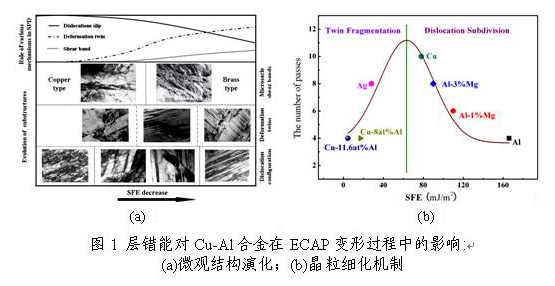 我所张哲峰研究员及其课题组成员在国家自然科学基金重大项目“金属材料强韧化的多尺度结构设计与制备”的资助下,最近以单相Cu-Al合金为研究对象,通过改变Cu-Al合金中Al的含量来调整其层错能,随后利用ECAP方法制备超细晶材料,系统研究了层错能对Cu-Al合金微观结构演化、晶粒细化机制、强度与延伸率的影响。对于微米尺度晶粒材料,已经知道层错能作为材料重要的本征参数对其变形机制和力学行为有着重要影响。对于Cu-Al合金随着Al含量的增加层错能逐渐降低,因此在ECAP过程中的变形机制也会随着铝含量的不同而呈现明显的区别,从而会显著影响其晶粒细化机制。在对具有不同成分的Cu-Al合金经过一道次ECAP挤压变形后,大量实验观察和统计结果表明:随着层错能的降低,变形孪晶和微观剪切带在承担严重塑性变形过程中起着越来越重要的作用,而且材料的滑移位错组态逐渐由波状滑移方式转变为平面滑移方式,微观剪切带从“铜型”剪切带转变为“黄铜型”剪切带,如图1(a)所示。由于微观变形机制的转变,在经过多道次ECAP挤压后,Cu-Al合金的晶粒细化机制也逐步由位错分割机制转变为孪晶碎化机制,如图1(b)所示。同时结合前人关于形成超细晶均匀组织的研究结果,发现具有相对较高或较低层错能材料比具有中等层错能材料更容易形成均匀的微观变形结构。