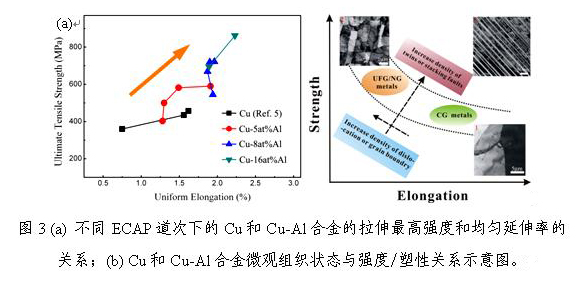 随后通过对经各道次ECAP挤压的Cu-Al合金样品进行拉伸实验发现,Cu-Al合金的强度和均匀延伸率随着层错能的降低具有同步提高的趋势,如图3(a)所示。大多数金属材料,单纯通过增加位错和晶界密度获得超细晶结构,虽然其强度得到明显的提高,但是由于加工硬化能力的缺失必然会导致其塑性的降低。结合最近报道的生长孪晶强化法和孪生诱导塑性机制,对于通过增加孪晶和层错密度得到的超细晶Cu-Al合金材料,不仅能够有效地提高其强度,而且可以利用孪晶和层错来容纳更多的位错而改善材料的加工硬化能力,从而使材料的塑性在具有高强度的同时维持在较好水平,因而其强度与均匀延伸率表现出同步增长的趋势,如图3(b)所示。
