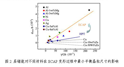 利用ECAP制备的超细晶材料,晶粒并不能无限细化,研究表明:当晶粒细化到一定尺寸后会形成一个最小平衡晶粒尺寸(dmin),通过综合前人研究结果,发现对于不同材料归一化的层错能Ý/Gb与其最小晶粒尺寸dmin/b之间遵循线性关系:dmin/b=K(Ý/Gb)(K是一个无量纲参数;b是柏氏矢量;G是剪切模量),如图2所示。同时结合其它制备超细晶方法中得到的dmin,通过比较其K值发现,归一化层错能Ý/Gb对最小平衡晶粒尺寸dmin/b的影响程度取决于外部变形条件的剧烈程度,外加变形条件愈剧烈,最小平衡晶粒尺寸对归一化层错能的影响程度愈小。其中ECAP变形程度在各种严重塑性变形方法中是相对较缓和的,这为通过改变合金的层错能来实现制备具有不同微观结构与力学性能的合金材料提供了新的研究思路。