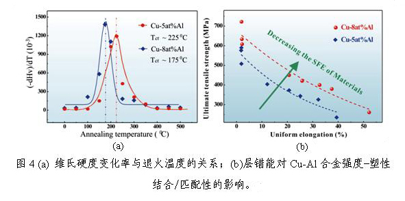此外,通过对ECAP制备态的超细晶Cu-Al合金进行了一系列的退火和硬度实验,发现随层错能降低,微观剪切带在细化晶粒和承担微观变形方面起着更为重要的作用,这使得低层错能的超细晶Cu-Al合金的微观结构中存在更多容易进行再结晶形核的位置,从而其热稳定性比之高层错能的Cu-Al合金稍差,如图4(a)所示。对经过不同温度退火的Cu-Al合金进行拉伸试验,发现具有高Al含量的Cu-Al合金的拉伸强度-均匀延伸率均高于具有低合金含量的合金,这进一步证实了层错能对合金强度与塑性的重要作用,如图4(b)所示。