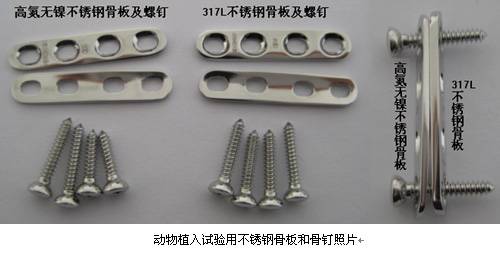 生物医用材料与器件课题组于2008年发布了该新型医用高氮无镍奥氏体不锈钢的企业标准《外科植入物用高氮无镍奥氏体不锈钢Q/KJ.05.10-2008》,并与国内相关医疗器械生产企业合作开发了无镍奥氏体不锈钢骨科用内固定器械和抗凝血心血管支架等新型医疗器械产品。新开发的无镍奥氏体不锈钢骨科内固定骨板系统在广州军区总医院完成了新西兰大白兔股骨骨折骨板重建动物试验研究,对比研究了高氮无镍奥氏体不锈钢骨板系统与目前临床应用的317L奥氏体不锈钢骨板系统在兔子体内股骨固定过程中对骨折愈合过程的影响。在成功建立了家兔股骨骨折模型的基础上,X线检查、组织学观察、生物力学及免疫组合等检测表明,该新型高氮无镍奥氏体不锈钢内固定骨板系统完全满足骨折内固定的基本要求,能够实现骨折内固定及促进愈合的功能。由于无镍不锈钢优异的力学性能,其骨板厚度仅为317L不锈钢骨板的80%。