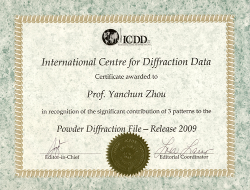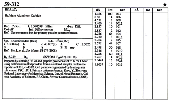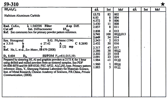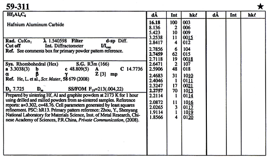 日前,耀彩网高性能陶瓷材料研究部研究生何灵峰(导师周延春研究员)发现的三种Hf-Al-C新化合物的X-射线衍射数据被国际衍射数据中心(ICDD)收录。有关化合物和JCPDS卡片号为Hf3Al3C5 59-310、Hf3Al4C6 59-311、Hf2Al4C5 59-312。
