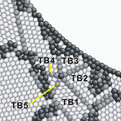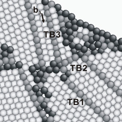 近年来,沈阳材料科学国家(联合)实验室固体原子像研究部王绍青研究组成功将准连续介质方法应用于晶界相关的纳米金属力学行为模拟,在材料力学性质多尺度计算模拟方面取得了一系列进展。他们通过准连续介质方法模拟了纳米多晶铝的压痕实验过程,观察到了五重对称变形孪晶的形成。采用粗粒化局部应力算法,计算了该五重孪晶形成过程中模型内部原子级的应力场分布。进一步的应力分析结果表明,材料内部高局部应力位置的变化是五重对称变形孪晶形成的重要条件。其中,一段低指数非对称晶界在该五重孪晶的形成过程中起到了重要作用,它将高静水应力局限在压头下方几个晶粒的区域内,并且造成位错反射,从而形成了该五重对称变形孪晶中的第一条孪晶界。该模拟结果可对近期电镜实验观察到的纳米金属中五次对称变形孪晶的形成原因给出较合理的解释。此前他人采用纯双晶模型对这类特殊晶界已经进行了深入研究,然而却没有与具体的实验现象相关联。五重孪晶的模拟结果说明了以这种特殊晶界为代表的微观结构对材料力学行为的重要影响。