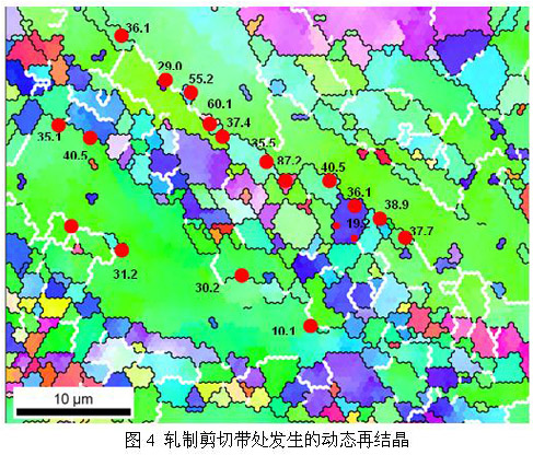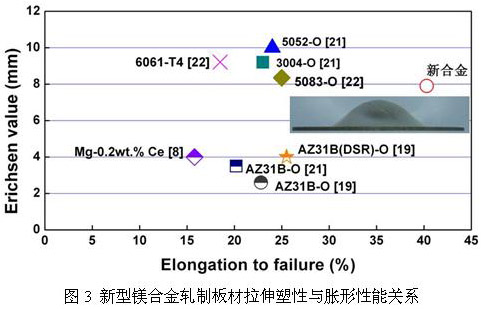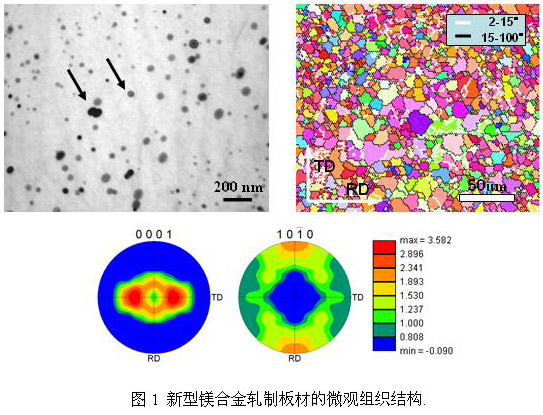 材料环境腐蚀研究中心韩恩厚、陈荣石研究员带领博士生闫宏、吴迪在镁合金相平衡热力学原理和相图计算基础上,通过添加适量的稀土元素,如Y、Nd、Gd等,优化轧制工艺、中间退火和轧制后的最终退火工艺,研究了一系列Mg-Zn-RE合金轧制板材的组织、织构和各向异性。结果表明,新合金系不仅具有优良的轧制性能,轧制后获得了均匀的再结晶组织,同时,细小的第二相均匀地分布在基体中(图1)。该合金板材的织构与AZ31板材明显不同,织构中晶粒的c轴向板材的横向偏转±30-45°,类似于等通道制备的AZ31(图1),且织构的强度明显低于轧制AZ31镁合金板材。具有弱基面织构的新型镁合金轧制板材室温下沿板面拉伸时,大部分晶粒的基面滑移都具有高的schmid因子,大量基面滑移被启动,有效协调板材厚度方向的应变,并抑制压缩孪晶的产生,显著提高其伸长率,降低各向异性因子。板材的应变硬化指数(n值)高达0.25-0.29,轧向伸长率约33%;横向伸长率接近50%(图2);表征各向异性的Lankford值(r)很低,仅为0.8到1.3,r值接近1表明板材在拉深成形过程中产生制耳的可能性小;Erichsen实验表明该板材的成形性能接近一些典型的铝合金(图3)。IE值约为8,远高于商业镁合金的4,意味着新型板材不仅可以轻易地在平板上进行加强筋、花纹图案、标记等局部成形,而且可以进行飞机和汽车蒙皮等薄板的拉胀成形。研究发现,与铝合金利用第二相颗粒促进再结晶形核(Particle Stimulated Nucleation,PSN)弱化织构的原理类似,镁合金中加入稀土元素形成大量细小的第二相对弱化轧制的基面织构起到了重要作用。同时,研究还注意到轧制过程中形成大量与轧制方向呈一定角度的剪切带,动态再结晶优先在这些剪切带中发生,其再结晶晶粒具有随机取向(图4),弱化了基面织构。关于该新型材料的动态再结晶机理及其与轧制板材的织构形成、室温高塑性和高成形性能的关系仍需更深入的研究。相关技术可能加速镁合金板材、管材、型材及复杂结构零件大规模工业生产和应用的步伐。