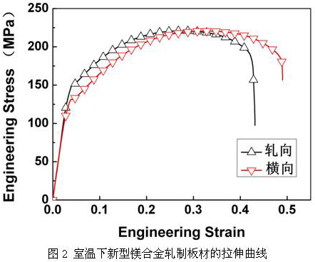 利用轧制技术大批量生产性能优良的镁合金板材,通过冲压、冲锻等二次成形工艺制造复杂零件,是使其获得更广泛应用的重要途径,人们对此表现出了极大的兴趣。然而,现有商用AZ31镁合金在轧制过程中会形成强烈的基面织构,中低温变形时具有低的应变硬化指数(一般小于0.15),塑性流变的稳定性低,无法获得高塑性,室温的纵向和横向塑性一般在15~25%;且存在强烈的各向异性(各向异性因子一般大于2.5)和拉压不对称性,成形过程中容易开裂,因此一般需在高温(250℃以上)成形。镁中添加Li元素,形成α-Mg + 高塑性的β相的双相合金或完全单相β的Mg-Li合金,具有优良的室温塑性,可以室温轧制及二次成形。然而,大量Li元素的加入,显著降低了镁的强度和抗腐蚀性能,且价格高昂,应用范围十分有限。利用非常规的方法,如等通道角挤压(ECAE),可弱化AZ31镁合金的基面织构,材料表现高达45%以上的拉伸伸长率,但这些材料尺寸小,没有应用价值。因此,研发具有高塑性、一定强度和抗腐蚀性能、适合室温或低温成形的镁合金板材对扩大镁合金的应用有重要意义。