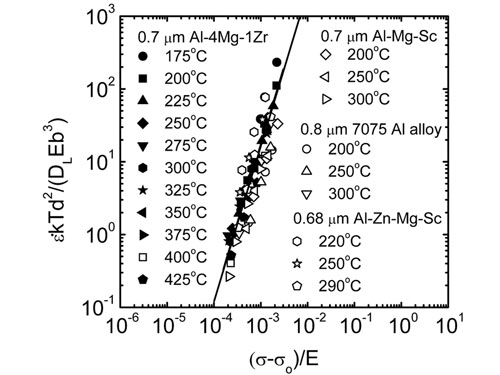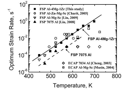 超塑性本构方程预测,随实验温度升高,最佳超塑应变速率增加。然而由于细晶结构在高温下容易粗化,这一预测一直没有得到很好的实验验证。即使对于含有热稳定性好的Al3Sc的Al-5.3Mg-0.23Sc合金,由于弥散粒子密度不够高,超细晶在350oC以上异常长大,导致超塑性消失,仍不能验证上述预测。采用含有更多Al3Zr弥散粒子的FSP超细晶Al-4Mg-1Zr进行的研究表明,该合金显示出优异的热稳定性,即使在高温下退火,晶粒也无明显长大,在175-425oC的广泛温度范围内,表现出良好的低温/高应变速率超塑性,最佳超塑性应形速率
