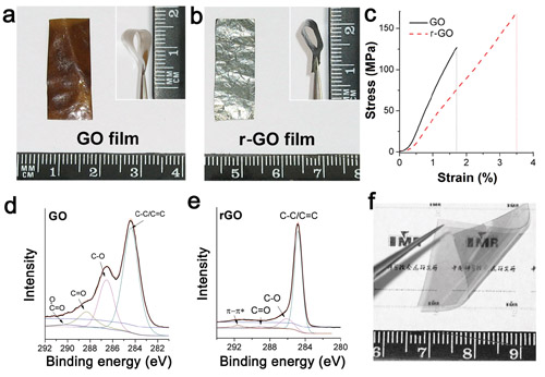 利用氢碘酸还原氧化石墨烯薄膜的还原效果 a、b:还原前后的GO薄膜的宏观光学形貌;c: 还原前后薄膜的拉伸应力-应变曲线;d、e:还原前后薄膜表面的XPS-C1s谱图;f: 利用氢碘酸还原GO制备的柔性石墨烯透明导电薄膜