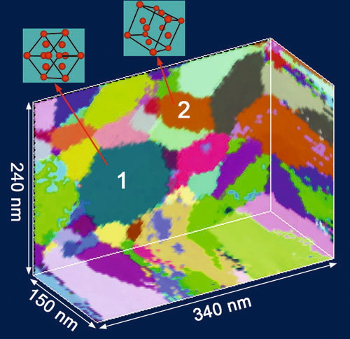 这种新的三维透射电镜表征技术是表征纳米材料的理想方法,它可对组成纳米材料的各个小晶体进行精确描述,包括其各个晶体的取向、大小、形状和在三维样品内的空间位置等。图1所示的是利用这种方法得到的纳米金属铝的三维微观结构特征图的一个例子。图中不同颜色表示不同的晶体取向,晶体的大小(从几纳米到约100纳米)和形状(伸长的或球体状的)都清晰地显示出来了。这些微观结构参数的精确定量测定为理解和优化纳米材料的性能提供了坚实的基础。