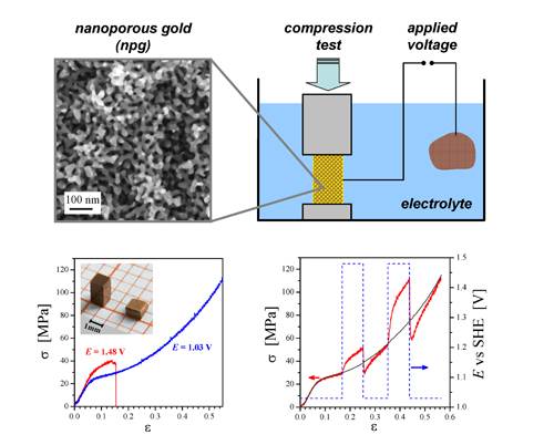 上图:纳米多孔金扫描电镜照片以及电化学环境下原位压缩示意图。左下图:不同电位下纳米多孔金的压缩应力-应变曲线以及(压缩)塑性变形前后样品照片。右下图:电极电位突变条件下原位测得的应力-应变曲线(红)。灰色曲线为恒电位(1.03 V)条件下测得结果。