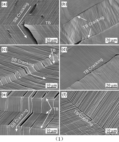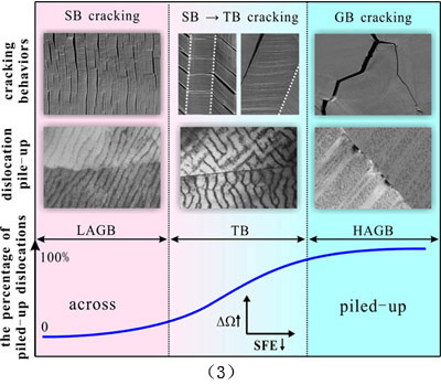 图(1)不同材料Cu(a,b)、Cu-10at.%Zn(c,d)和Cu-32at.%Zn(e,f)的滑移带开裂和孪晶界开裂行为。图(2)施密特因子差、层错能和滑移方式对孪晶界疲劳开裂行为的影响(A-F:Cu,Cu-10at.%Zn,Cu-5at.%Al,Cu-8at.%Al,Cu-32at.%Zn,Cu-16at.%Al)。图(3)小角晶界、孪晶界面与大角晶界低周疲劳开裂倾向性关系。