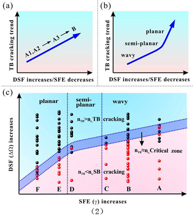 根据以上关于晶体取向和层错能对孪晶界面处位错塞积数目的影响,再结合位错滑移方式对孪晶界开裂的影响,他们建立了Schmid因子差(ΔΩ)、层错能(γ)、滑移方式和孪晶界面开裂的临界判据半定量方程: