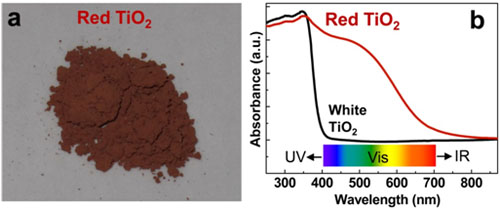 图a:红色TiO2的照片;图b:红色和白色TiO2的紫外-可见吸收光谱。
