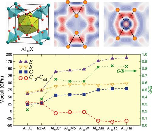 众所周知,纯铝强度低,存在典型的金属键。Al12W类型金属间化合物中铝原子含量高达93%。在面心立方结构铝中,每个铝原子都有十二个最近邻的铝原子围绕。相似地,在Al12W类型金属间化合物中,过渡族金属元素钨也被十二个最邻近的铝原子所围绕,形成五重旋转对称的二十面体,因此这些化合物也常被称为类准晶化合物。通过第一原理计算发现,当二十面体内的价电子浓度达到临界值以上,材料内金属键转变成共价键,从而导致其机械强度和纯铝相比得到大幅度提高。随着二十面体内价电子浓度的进一步增加,机械强度的提高更加显著。这种机制为研究和提高材料强度提供了新视角,首先它使人们认识材料的强化方式从阻碍位错运动扩充到调控材料内部的化学键属性;其次,通过人为手段(比如合金化和外在的势场)在材料局部或全域引入更多的额外电子诱导共价有针对性地提高材料的强度。还为本质上理解一些金属间化合物、准晶和金属玻璃具有高强且脆的属性提供了线索。