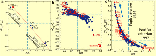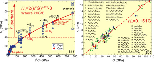 受此强化机制的启发,科研人员还研究了上世纪90年代Pettifor提出的Cauchy压力对材料化学键的判据和50年代Pugh模量比率(对应泊松率)对材料韧脆的判据经验关系,通过对330余种立方晶格材料、近6000个数据进行分析,建立起Cauchy压力与Pugh模量比率之间的关系。在此基础上,研究还揭示了硬材料的维氏硬度与材料Pugh模量比率的平方和剪切模量G的乘积具有函数关系:Hv=2(K2G)0.585-3 (k=G/B;这里B是体积模量);如果材料完全在弹性范围内失效(例如金属玻璃、准晶等),其硬度与G成严格线性关系:Hv=0.151G。上述硬度模型的提出统一了过去广泛存在的争论,表明硬度不仅关联到由Gilman观察到的体积模量,而且也关联到Teter观察到的剪切模量。上述理论模型成功预测了所有已知的超硬材料的硬度,并进一步解释了具有争议的碳的同素异构体T-carbon的硬度,揭示了传统的半经验硬度理论模型对各向异性材料失效的物理本质。