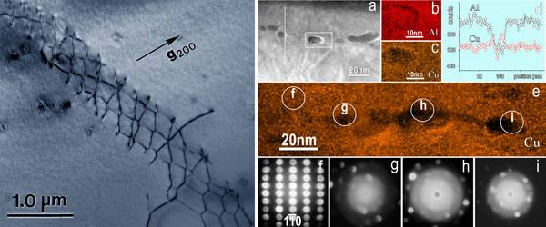 2Cu析出相中典型的位错组态之一(左图)以及经严重变形后(110)滑移面上的成分和结构信息(右图)。位错在具有四方点阵结构的Al