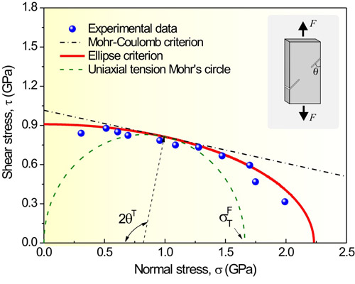 2010年,张哲峰研究员与其博士研究生屈瑞涛在Zr基金属玻璃拉伸试样中引入了一系列不同角度倾斜缺口,控制剪切断裂沿不同角度面发生,在断裂瞬间不同剪切面具有不同的正应力与切应力组合,系统地研究了正应力对拉伸断裂行为的影响。基于对多种金属玻璃拉伸强度数据和断裂行为的理论分析,他们发现:相对于莫尔-库仑准则,椭圆准则能更加精确地定量描述正应力对金属玻璃拉伸强度与断裂行为的作用(图1),也能合理地解释前人在研究中所观察到的各种金属玻璃材料的拉伸断裂行为。该研究结果从实验上确定了椭圆准则的有效性,并证实椭圆准则可以作为金属玻璃材料的本征拉伸断裂准则。此项研究结果发表在J. Appl. Phys. 109 (2011) 083544。