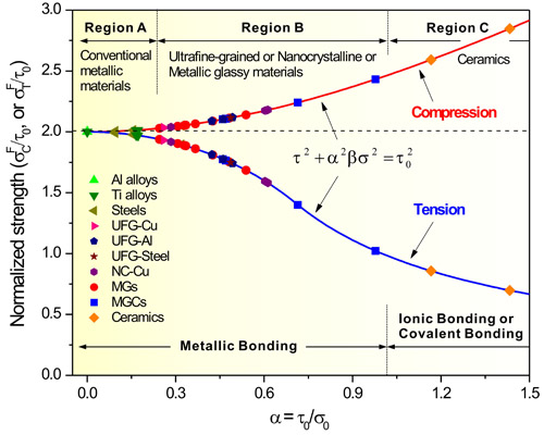 金属玻璃在拉伸载荷下的断裂行为可用椭圆准则进行很好地预测,那么其压缩断裂行为该如何描述?在复杂应力状态下的断裂行为又该如何预测?最近,张哲峰研究员与屈瑞涛博士考察了大量金属玻璃材料的拉伸、压缩以及纯剪切断裂行为,提出金属玻璃材料断裂的三个重要事实:(I) 拉伸与压缩断裂强度存在一定的不对称性;(II) 拉伸与压缩断裂角均偏离45°;(III) 纯剪切时断裂沿最大切应力面发生。基于这些实验事实,并同时考虑材料本征性能与外部实验条件对断裂行为的影响,他们提出了一种能描述复杂应力条件下断裂行为的普适性断裂准则(图2)。该准则认为金属玻璃剪切面上正应力在拉伸与压缩两种类型的加载条件下作用机制不同:拉伸正应力对剪切变形和断裂的影响比压缩正应力的影响更加强烈,这不仅符合宏观断裂的实验事实,也与微观剪切变形机制相一致。该普适性断裂准则不但继承了椭圆准则的统一性特点,具有明确的物理内涵,并且在数学上具有光滑连续性,便于作为失效判据在结构安全设计中的应用。在此基础上,他们通过进一步分析近年来发展的金属超细晶/纳米晶材料、金属玻璃及先进陶瓷等高强度材料的拉伸、压缩断裂行为,发现该普适性断裂准则还可对上述多种高强度材料的拉伸、压缩断裂行为(如强度不对称性、断裂方式等)进行统一性描述(图3),这为深入理解与研究高强度材料的断裂规律和在复杂应力条件下安全设计与可靠性提供了新的理论判据。该研究结果于2013年1月23日在Scientific Reports 在线发表。
