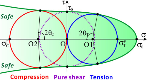 至此,剪切面上正应力对剪切变形和断裂的重要影响已经澄清,但是如何描述这一正应力效应仍然存在分歧。一种方法是采用传统的莫尔-库仑准则来半定量地对正应力的影响进行描述,该准则也是目前国际上对金属玻璃断裂研究使用较多的准则。如果定量地比较金属玻璃的拉伸与压缩强度及剪切断裂角的差别,就会发现一方面采用莫尔-库仑准则所预测的拉伸/压缩强度不对称性过大;另一方面该准则预测的拉伸/压缩剪切断裂角度之和恒为90°,这些都与实验事实明显不符。2005年,张哲峰研究员同时考虑剪切面上正应力和切应力对材料断裂的影响,并结合不同材料的性质,提出了新的统一拉伸断裂准则——椭圆准则,该准则不仅可以定量地描述各种金属玻璃材料拉伸断裂行为以及剪切与拉伸正断的转变,还从一个新的角度揭示了不同类型金属材料的强度差别与剪切变形机制。此外,该准则通过提出的新参数α——断裂方式因子的变化,将上述四个经典断裂与强度准则(最大正应力准则、屈特加准则、范×米塞斯准则和莫尔-库仑准则)有机地统一起来,这为材料的强度与断裂理论家族提供了新的判据。此项研究结果发表在Phys. Rev. Lett., 94 (2005) 094301。
