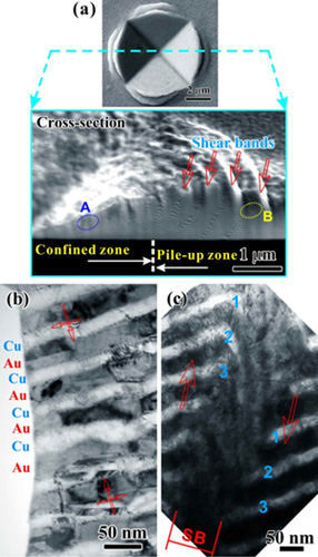 (a)压痕区下的剪切带变形,(b)和(c)约束变形区和剪切带区的透射电镜观察