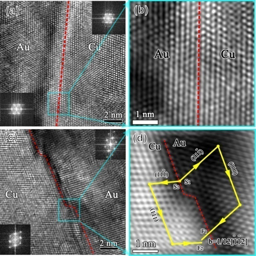 图2 纳米尺度Cu/Au层状材料界面结构观察,(a)和(b)变形前,(c)和(d)变形后