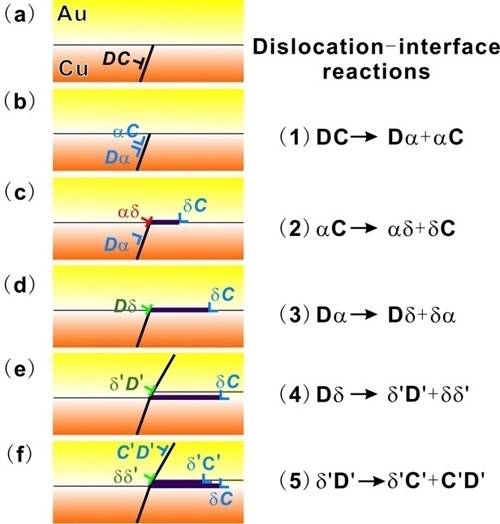 这项研究发现,在由面心立方铜/金异质界面构成的纳米层状材料中,压痕下约束变形区和剪切带中的铜层均比金层发生了更为严重的薄化变形。实验观察与计算表明,沿铜/金界面的切应力是导致铜层薄化程度大的根本原因。通过原子尺度的界面结构观察与理论分析,他们发现:平行于铜/金层界面的切应力分量能够解锁点阵位错-异质层界面反应产物,从而促进了位错跨过异质界面,导致铜层连续薄化。为此,他们提出了一个全新的“切应力诱导纳米层状材料塑性变形能力再生”的物理机制。
