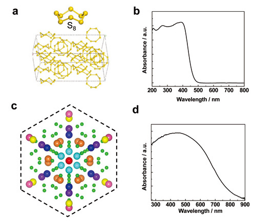 硫单质具有30余种同素异形体,多数由6-20个硫原子组成的环状分子构成,在标准温度与压力条件下,皇冠状结构S8分子最稳定,它的正交结构晶形α-S最稳定(图1a)。研究发现α-S晶体的带隙为2.79eV,可吸收至约475nm的可见光(图1b),且具有适合光催化反应(分解水、羟基自由基生成)的带边位置。进一步的光催化活性研究表明α-S晶体在可见光条件下具有光电化学分解水制氢、产生羟基自由基、降解污染物罗丹明B的能力,减小晶体颗粒尺寸可显著提高光催化活性,同时α-S晶体作为光催化材料展现出高的光化学稳定性。