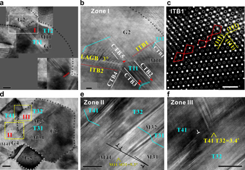 图1 循环加载后的20 nm厚金薄膜微观形貌观察。a、d为带有多重孪晶的粗化晶粒;b、c和e、f 为相应区域的放大图。标尺: a、d-f为5 nm,b、c为1 nm。