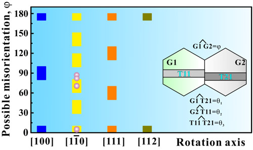 图3 适合孪晶辅助纳米晶粒长大的晶粒取向差关系