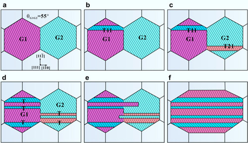 最近,沈阳材料科学国家(联合)实验室材料疲劳与断裂研究部张广平研究员领导的课题组(包括博士生罗雪梅和朱晓飞副研究员)通过对纳米尺度面心立方结构的金薄膜疲劳加载下晶粒长大原子尺度的观察与理论分析,揭示了孪生辅助纳米晶粒长大的物理机制。这项研究发现,室温下的疲劳加载导致平均晶粒为19 nm的20 nm厚金薄膜中晶粒长大;同时,发生孪生的晶粒数目明显增加。大多数长大的晶粒中出现了纳米尺度的多重孪晶。通过原子尺度的观察和分析发现:纳米孪晶的形成是辅助晶粒长大的一个有效方式。这一物理过程为:疲劳加载下孪晶的形成可以逐渐改变晶粒的局部取向,并促使晶界分解为易迁移的片段(图1);随着循环周次的增加,两个晶粒通过相互的孪晶形成以及晶界的不断分解,逐渐合并长大为一个晶粒。为此,科研人员提出了一个循环加载下“孪晶辅助纳米尺度金薄膜晶粒长大”的全新物理机制(图2)。