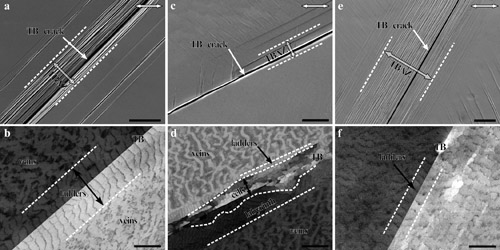 图1 与加载轴不同夹角的孪晶界面的疲劳开裂形貌及其附近的位错组态(a、b)45度;(c、d)30度;(e、f)60度。
