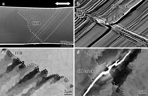晶界与孪晶界面对于金属材料的强韧化设计与抗疲劳损伤开裂能力的提高具有重要影响。通常在单向拉伸载荷下,晶界普遍可以作为强化元素提高材料的强度,而在循环载荷下,晶界却容易成为薄弱环节而优先萌生疲劳裂纹。沈阳材料科学国家(联合)实验室材料疲劳与断裂研究部张哲峰研究组前期开展了一系列含有大、小角晶界铜双晶体的低周疲劳实验。他们发现:无论加载方向与晶界的夹角如何,大角晶界总是优先开裂,而小角晶界则不疲劳开裂。这一系列工作发表在Progress in Materials Science, 53 (2008) 1025上。考虑到孪晶界面对金属材料强韧化具有重要影响,为此,该研究组张振军博士通过各种铜合金多晶体中孪晶界面低周疲劳实验研究发现:孪晶界疲劳开裂倾向介于大角晶界和小角晶界之间,并且受到层错能和晶粒取向影响。通过晶体学取向分析,他提出了决定孪晶界面疲劳开裂与否的层错能与取向差判据,即随层错能降低或孪晶界两侧施密特因子差增加,位错滑移跨过孪晶界的机会减小,致使得孪晶界更易于萌生疲劳裂纹。这项工作发表在Acta Materialia, 60 (2012) 3113和Applied Physics Letters, 101 (2012) 011907上。