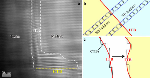 图4 非共格孪晶界的高分辨率像(a)及两种塑性变形机制示意:(b)位错贯穿机制;(c)非共格孪晶界迁移机制。