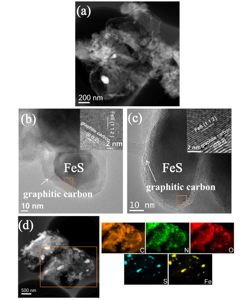 图1 Fe/N/C催化剂中铁晶态物质的透射电镜图 (a): STEM; (b), (c): HRTEM; (d): HAADF-STEMMaps