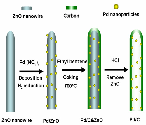 图1 Pd/C 复合催化剂的制备示意图和电镜表征结果,图D中的标注说明Pd 纳米颗粒明显的嵌入到碳载体的壁中。