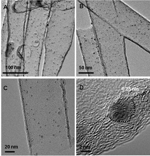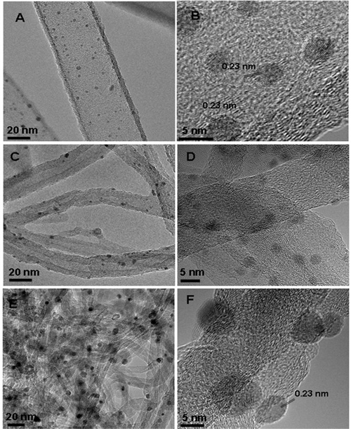 图2 Pd/C催化剂氩气500摄氏度处理后的电镜表征结果(A,B),新鲜的Pd/CNT 催化剂的电镜表征结果(C,D),Pd/CNT 在相同条件下处理后的电镜表征结果(E,F)。和Pd/CNT相比,Pd/C 复合催化剂具有较高的抗烧结能力。