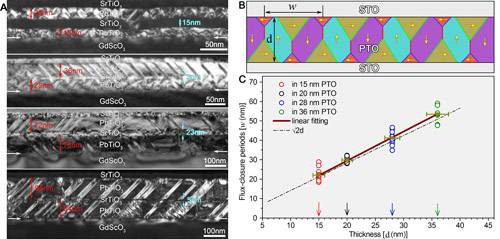 图6、PbTiO3铁电体中周期性闭合结构的形成规律。在一定的薄膜厚度范围内,通量全闭合畴结构构成的周期性阵列的周期大小与薄膜厚度之间成比值约为