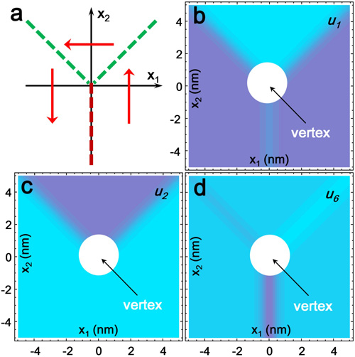 图5、在Landau-Ginsburg-Devonshire理论框架下计算出三个畴交界处的二维应变分布,在此基础上推导出闭合结构核心处目前最高量级弯电常数(10-10C-1m3)