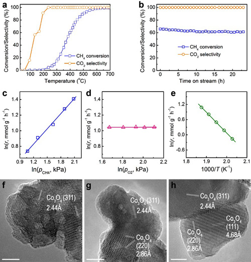 图2:甲烷燃烧催化反应动力学及反应后催化剂表征