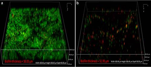 与铜绿假单胞菌共培养7天后的细菌生物膜活/死染色后的生物膜形貌,